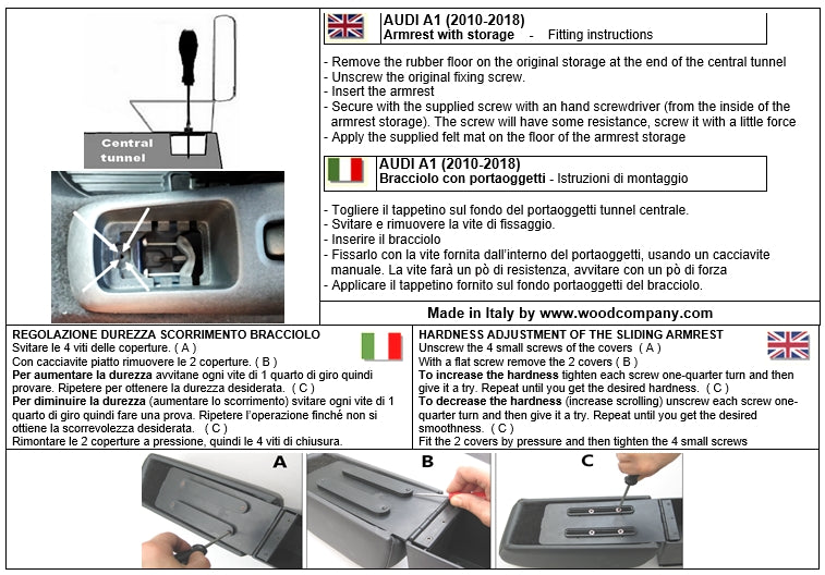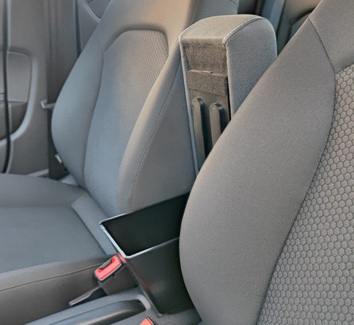 Bracciolo regolabile in lunghezza specifico per Audi A1 (2010-2018) con installazione in “PUNTI ORIGINALI” (utilizzando punti di fissaggio già presenti sul tunnel centrale, evitando quindi di danneggiarlo praticando nuovi fori.