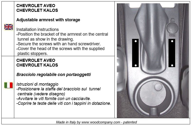 Bracciolo regolabile in lunghezza per Chevrolet Aveo (2006-2010). Dotato di uno spazioso portaoggetti e di un morbido cuscino. Facendo scorrere in avanti il cuscino si accede al portaoggetti sottostante (vedi foto nella gallery). All’interno del portaoggetti è presente un comodo inserto portabicchiere.
