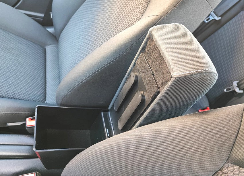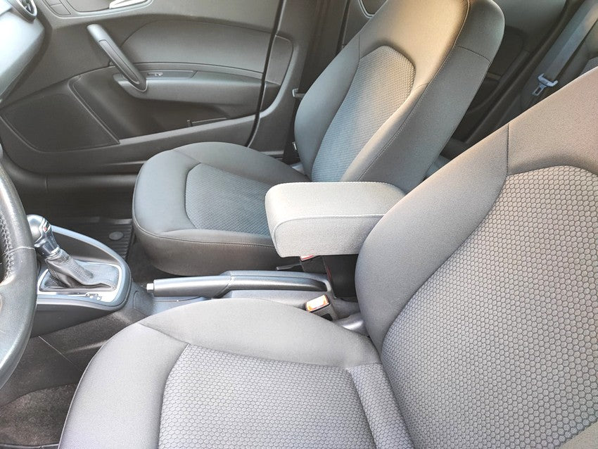 Bracciolo regolabile in lunghezza specifico per Audi A1 (2010-2018) con installazione in “PUNTI ORIGINALI” (utilizzando punti di fissaggio già presenti sul tunnel centrale, evitando quindi di danneggiarlo praticando nuovi fori.
