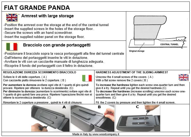 Bracciolo regolabile in lunghezza specifico per Fiat GRANDE PANDA versione standard (fissaggio con 2 viti che creano 2 piccoli fori sul fondo del portaoggetti sul tunnel centrale).