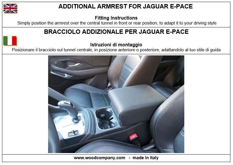 Bracciolo addizionale specifico per Jaguar E-Pace con installazione “PLUG-IN” (a pressione, senza bisogno di viti, evitando quindi di danneggiare l’auto praticando fori).
